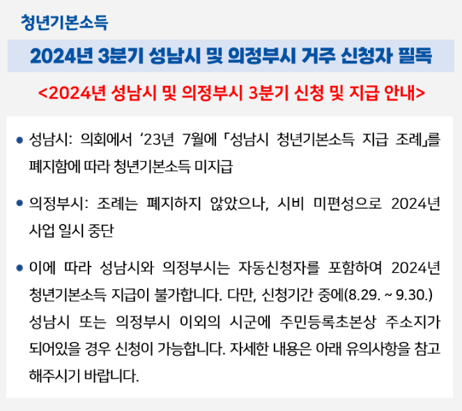 경기도 청년기본소득은 경기도에 3년 이상 계속 거주하거나, 합산 10년 이상 거주한 만 24세 청년들을 대상으로 합니다. 2024년 기준, 1999년 1월 2일부터 2000년 1월 1일 사이에 태어난 청년들이 신청할 수 있으며, 소득이나 재산 요건은 따로 적용되지 않습니다. 단, 성남시와 의정부시는 2024년부터 청년기본소득을 지급하지 않으므로 해당 지역 청년들은 지원 대상에서 제외됩니다.(성남시랑 의정부시는 조례를 폐지하여 지급을 할 수 없다고 하네요 ..ㅠㅠ 아래는 해당내용에 대한 공지입니다. )